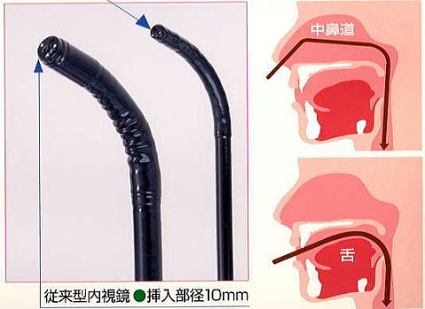 - 最新のデジタル信号処理により、細径でも鮮明な画像が得られることが挙げられます。勿論、鼻からの挿入に抵抗がある方は、従来どおり口から挿入しても、苦痛の少ない内視鏡検査ができます。